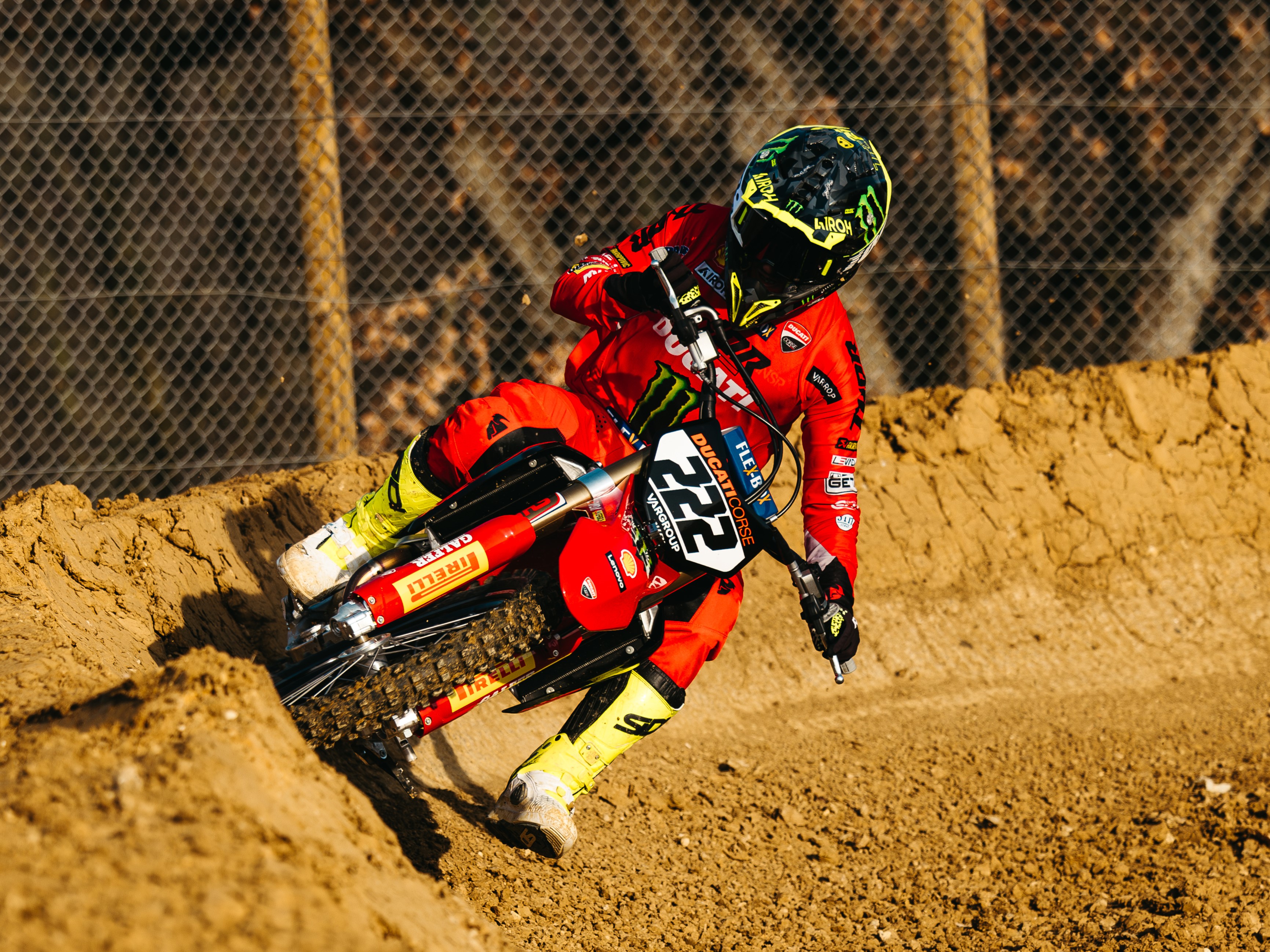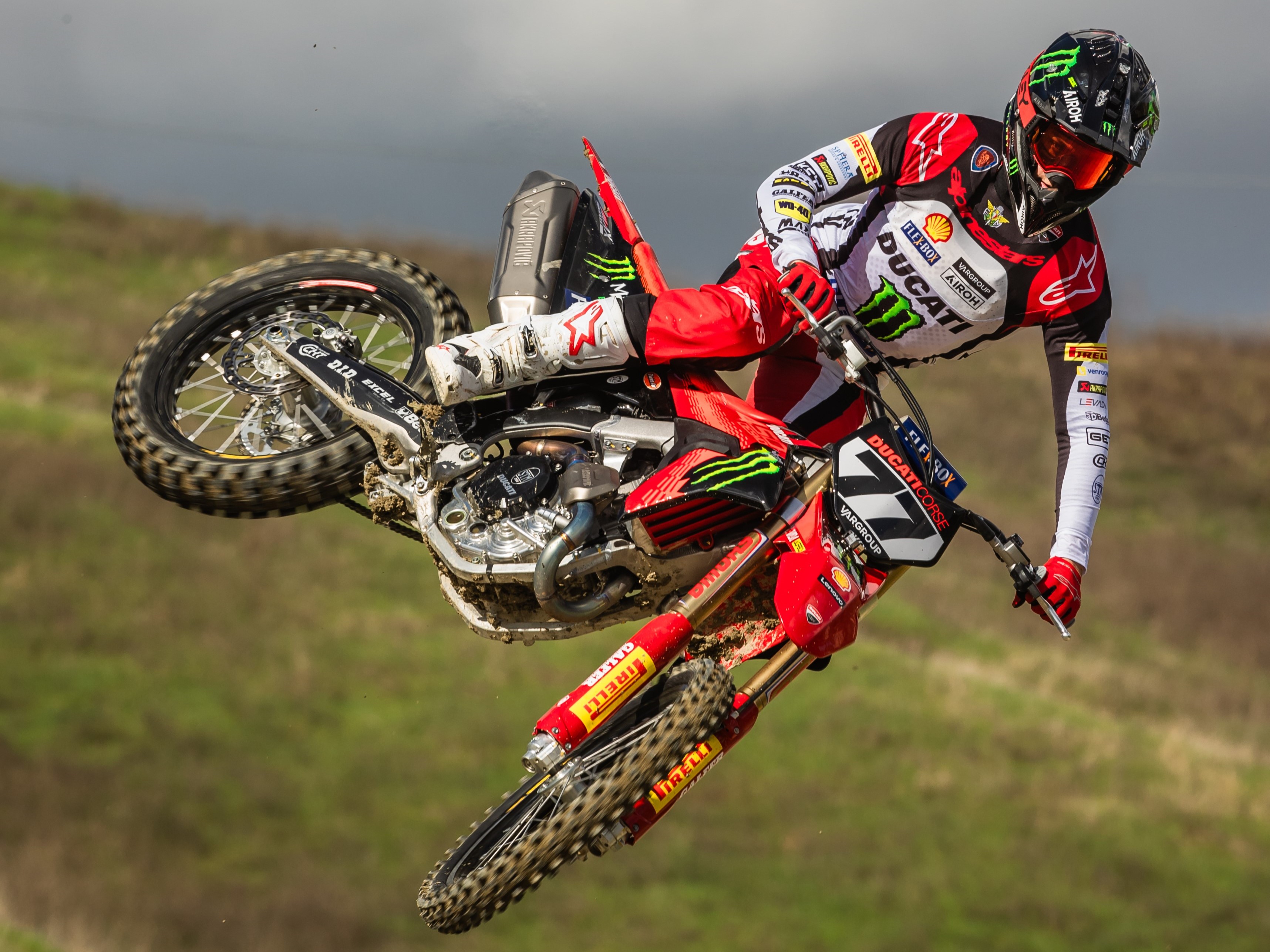 Var Group logo, which featured on the number plates and on the jerseys of the riders Alessandro Lupino, 8-time Italian champion and Antonio Cairoli, 9-time motocross world champion, took the bike to the track for intense development work, as well as on team members' clothing.
