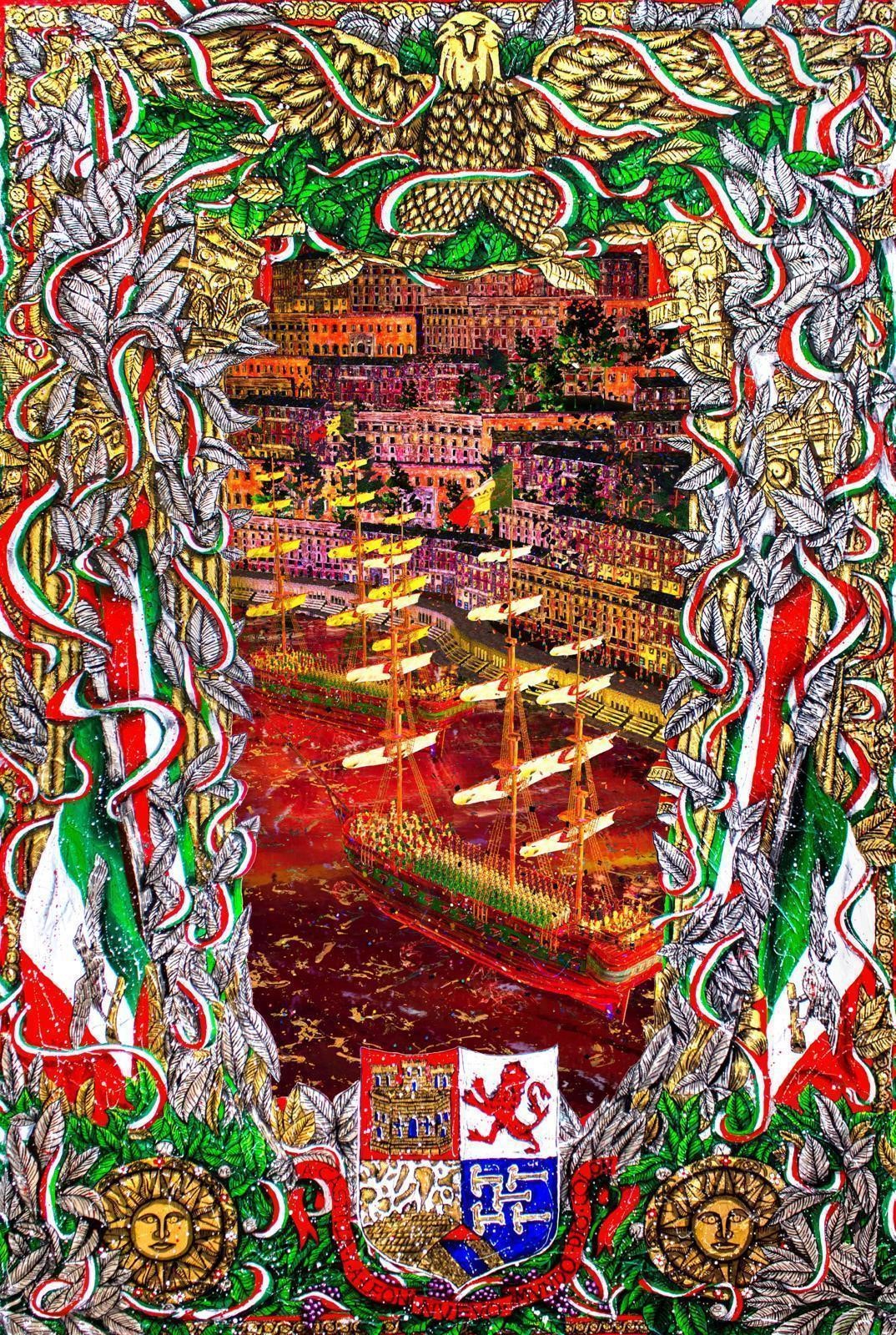 Description: The Amiable Exploiter, 2018 tells the story of the return of the Italian explorer Christopher Columbus. His naval fleet triumphantly crosses the infernal atmosphere of an imaginary landscape with Western features. The landscape recalls a surreal splendor between Las Vegas and ancient Rome.