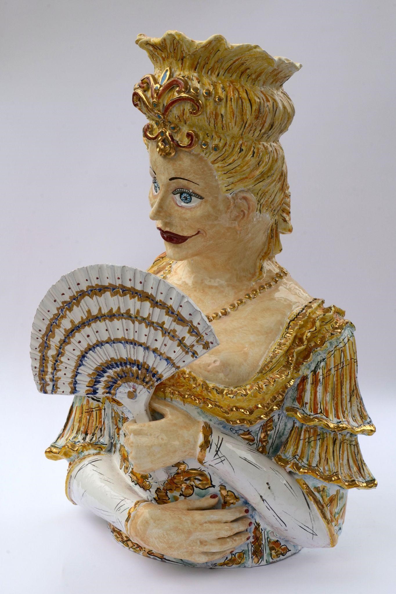 In the past years Solmi has been interested in rediscovering old ceramic techniques in the urge of creating a relationship between his digital work and the physical materiality of ancient craftsmanship. Inspired by Roman busts, originally used for propaganda reasons, the busts are a celebration of the main characters that populate Solmi’s videos, each of them carrying an ideological message in their pose. Solmi’s sculpture process is very unique. The original maquettes were made using 3D modeling software; the poses and characters taken from previous video and virtual reality works. They then transcend from the virtual realm and into physical objects when the clay busts are handmade and painted in Caltagirone, Sicily. Solmi is now interested in continuing this conversation between the digital and the analog by making digital holograms based on a series of physical sculptures.
