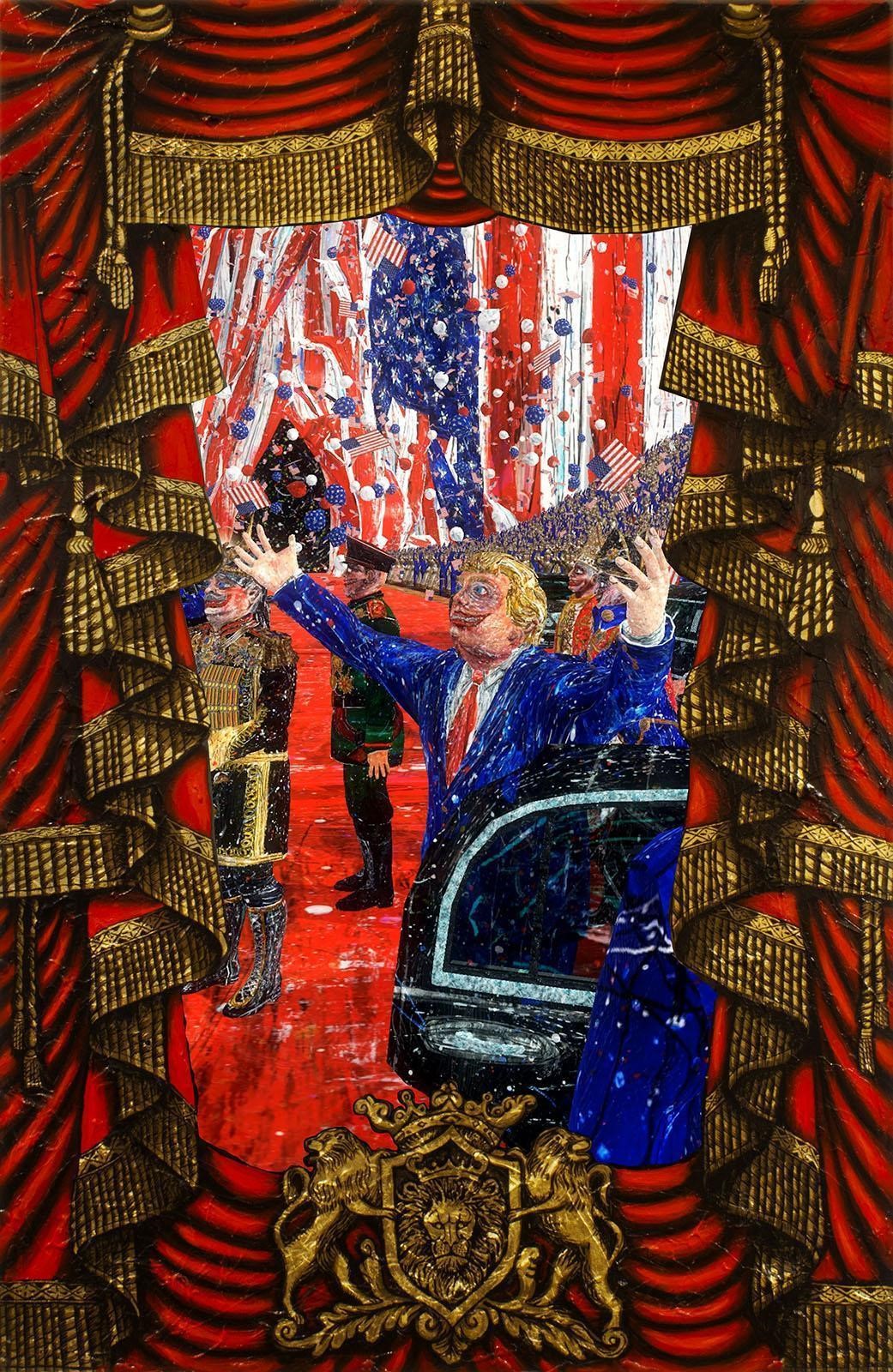 President Donald Trump parades in a limousine through crowds of cheering fans and a blizzard of American flags. Surrounded by paparazzi, and accompanied by famous and infamous leaders from throughout history, Trump leads his posse into the Whitehouse for the presidential inaugural ceremony, a celebration of ballroom dancing and bouncing balloons.