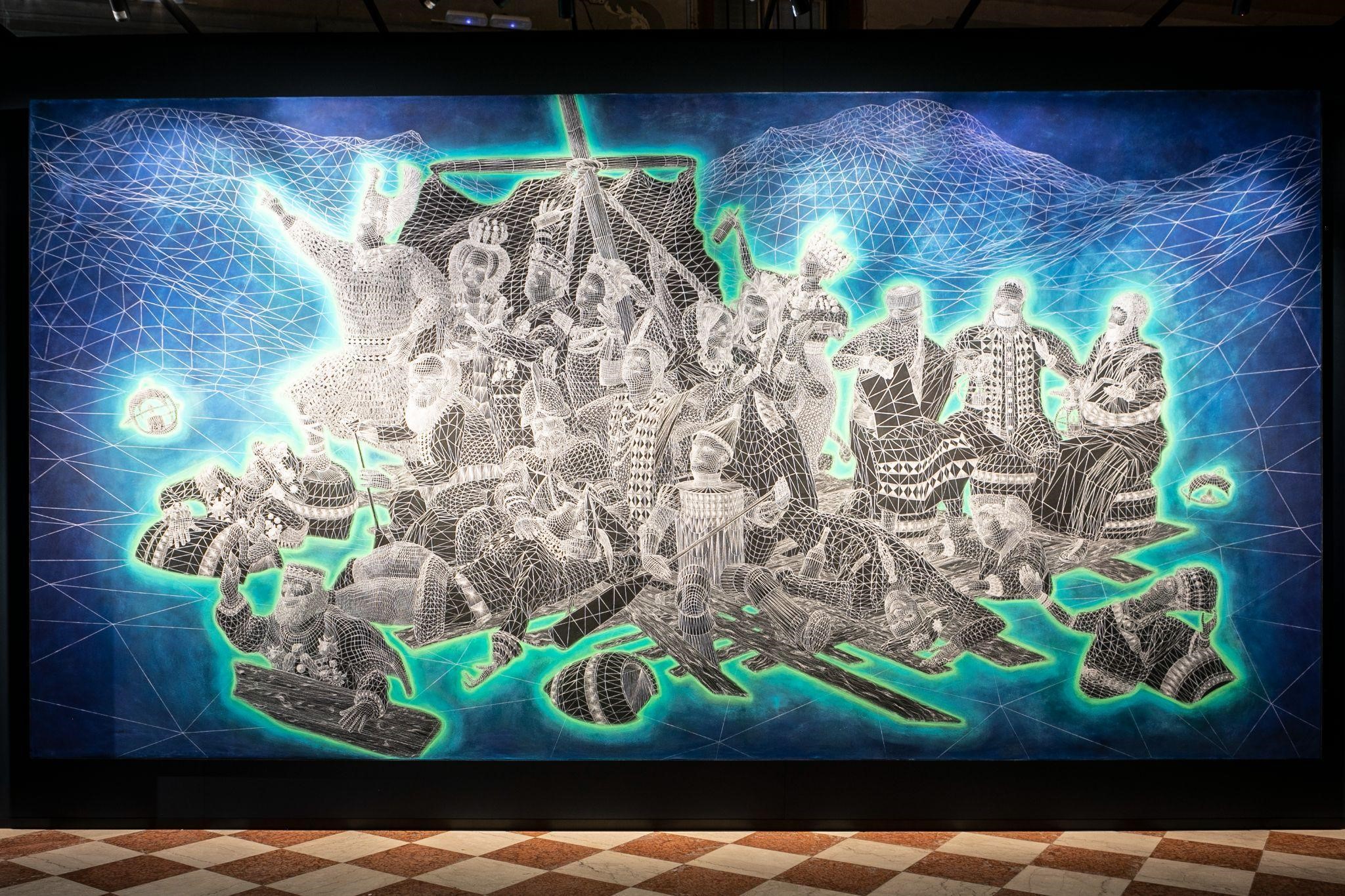 The Ship of Fools, the most ambitious of Solmi's recent works in terms of dimensions, contains the stylistic studies carried out by the artist in recent years. The artist recalls Gericault's masterful work, The Raft of the Medusa, challenging the now unusual style of the historical painting. Contemporary and historical leaders, from Garibaldi to Elon Musk, compose a grotesque theatrical show, staged on a raft lost at sea. The drama of the shipwreck is replaced by a bacchanalian atmosphere of celebration and perdition. Only three characters contrast with the pleasure-loving air, the three 'thinkers': the critic Lawrence Wechsler, the curator Larry Ossei-Mensah and the philosopher Socrates, appear focused on trying to find a way of salvation for a world in the hands of out-of-control leaders. The artist seems to suggest that art and thought are the only ways of salvation from the foolishness of present time and history. All the characters in the work are victims of a historical failure, protagonists of Western propaganda which for centuries has falsified real accounts through an ethnocentric point of view.