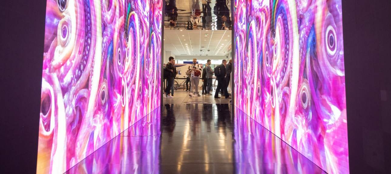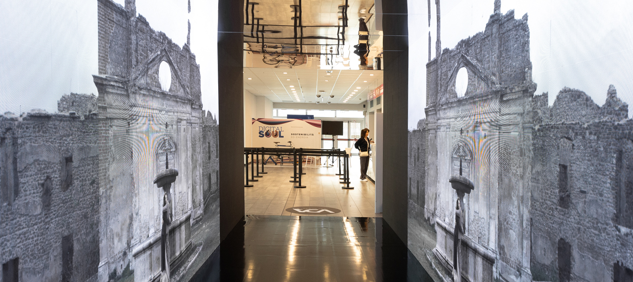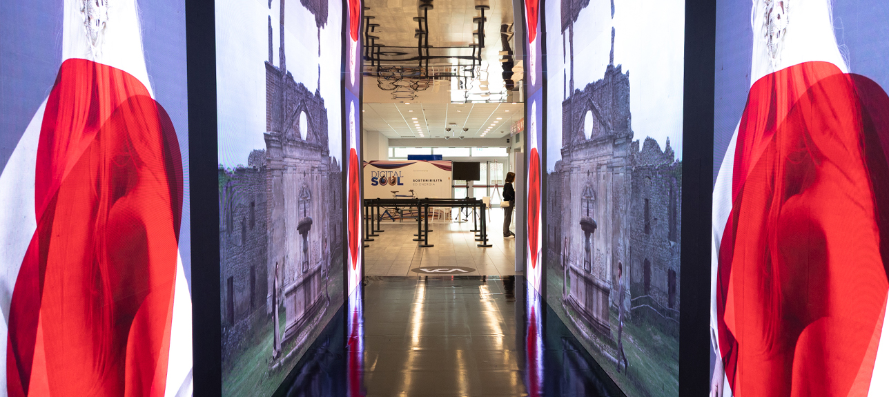 - an immersive 9-meter tunnel, a Stargate between the physical and digital worlds, symbolizing a journey through time - past, present, and future, interpreting various meanings conveyed by the works of artists Leonardo Petrucci, Pamela Diamante, and Matteo Basilè;